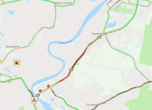 Delays on the Pacific Highway are stretched back to the Adelaide Street roundabout at Raymond Terrace, while the run along Tomago Road is slow.