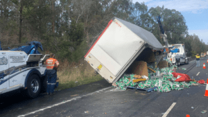 One of two southbound lanes on the Pacific Highway was closed after a truck transporting cartons of VB came unstuck just north of the Manning River Drive interchange.