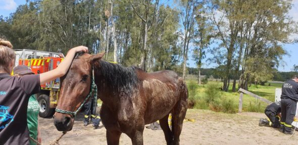 It’s believed the mare, which was stuck in a waterway on Port Stephens Drive at Nelson Bay, had been unable to get out all night before Fire and Rescue NSW crews came to its rescue late this morning.