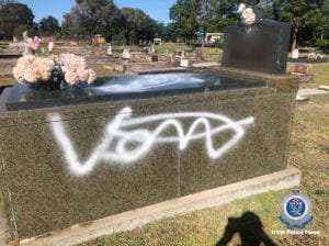 Officers from the Manning-Great Lakes Police District arrived at the cemetery on The Lakes Way this morning, to find at least a dozen gravesites damaged by white spray paint.