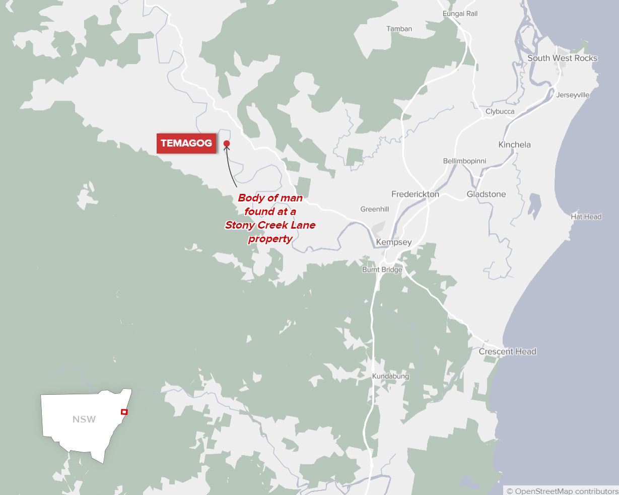 The man’s body was found by police, next to a bulldozer that was destroyed, about 30km west of Kempsey.